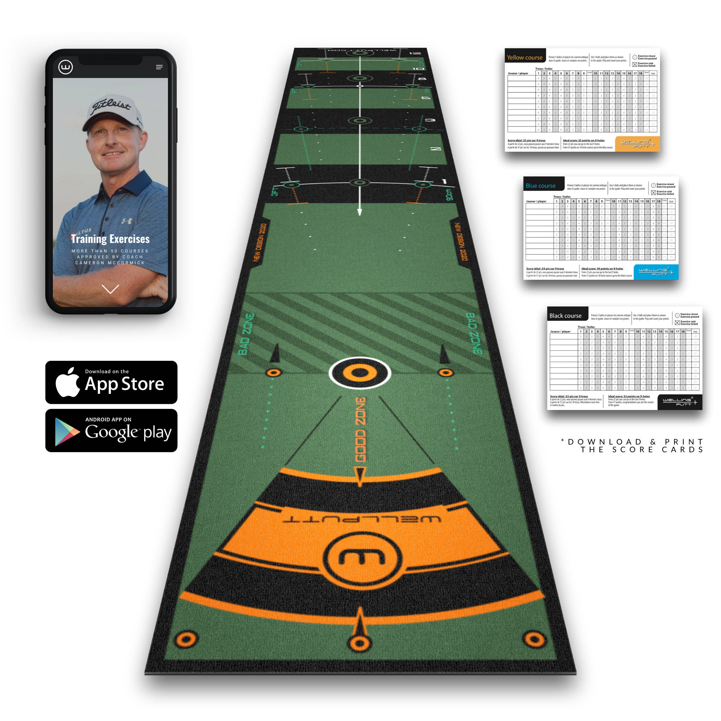 A WellPutt szőnyegen különböző távolságokra lévő célpontok találhatóak. Gyakorolhatja a downhill / lejtő/ vagy az uphill / emelkedő/ gurításokat is a kialakított zónák segítségével.